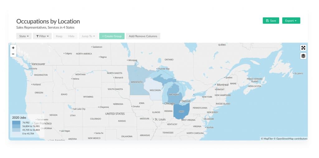 Recruiting – A business conducts a national scan for the best place to recruit new sales reps. They discover a high concentration of sales talent in three smaller cities in the Midwest—a much less competitive hiring landscape than cities on the West Coast. So they build a recruiting strategy that targets these Midwest cities, and as a result attract more attention from solid candidates.