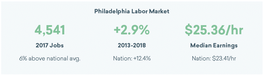 Let’s lean on data again to discover a region with more favorable conditions and larger talent pools. If you look at Philadelphia for example, the demand for graphic designers has increased by about 3% since 2013 (about 9% less than the national average).
