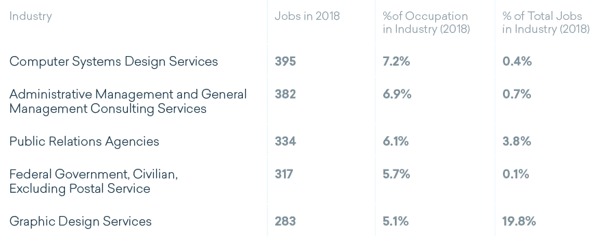 Using data, we can determine that the largest portion (7%) of all graphic designers in D.C. work in the computer systems design services industry. The rest of the majority work in administrative management and general management consulting services (6.9%); public relations agencies (6.1%); the federal government, civilian, excluding postal service (5.7%); and graphic design services (5.1%).