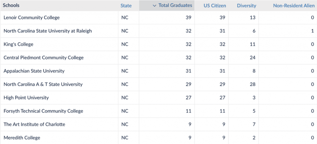Looking at the data, you can confirm that in 2017, 288 people in North Carolina graduated from graphic design programs. Lenoir Community College was at the top of the list, followed by North Carolina State University at Raleigh. If your computer programming firm doesn’t have relationships with these schools already, you might want to create them.