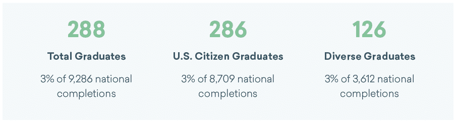 We also see that nearly all of these graduates are U.S. citizens, and 126 are considered diverse graduates. Comparing other schools by region in this way allows you to quickly view the diversity amongst programs and assess your recruiting efforts in those areas.