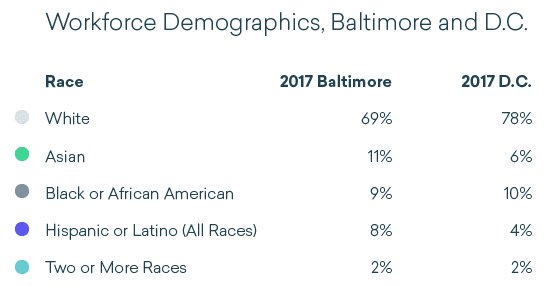 Using data, you can determine that in Baltimore, about 22% of the graphic design workforce is considered diverse, but this percentage only represents about 340 people. Tricky.