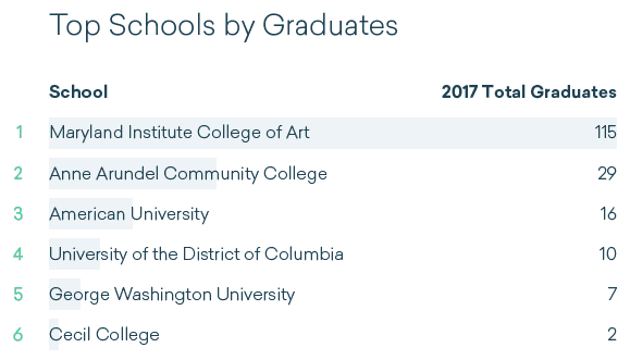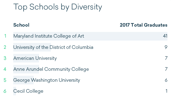 As an additional step, let’s look at the colleges in D.C. and Maryland to see which schools might have the most diverse graduates. First, data shows that the Maryland Institute College of Art has the most graphic design graduates per year. That is followed by Anne Arundel Community College and American University.