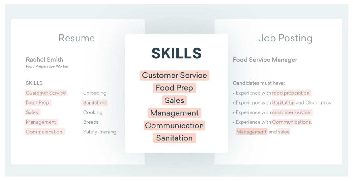 Incumbent workers and job seekers have profiles and resumes with skills that can be parsed and tagged. Similarly, employers have job postings with skill requirements which can be parsed and tagged. Because skills are the fundamental units that transmit value, clearly matching the skills within resumes and job postings allows employers to better identify talent and job seekers to determine what roles they’re qualified for.