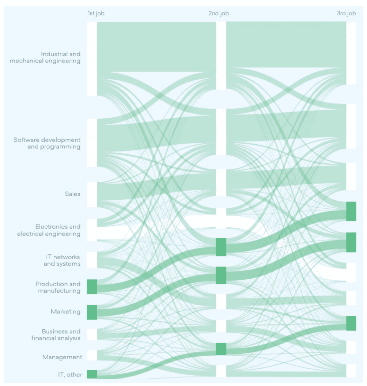 Using job history data from online profiles, probability percentages of occupation transitions can be produced. If we know an individual’s job history, skills data makes it possible to determine what roles they are best suited to move into. Below is an example of what this could look like for engineering graduates. This can inform communities and learning providers where upskilling is necessary, or perhaps reskilling is needed to get the individual into their desired job.