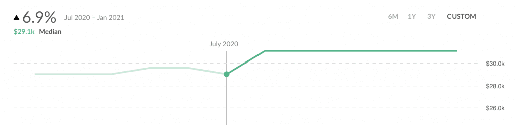 Forklift Operators – Between July and August of 2020, advertised wage for forklift operators in Detroit jumped from $14/hour to $15/hour—a 7% increase in one month! What happened? Amazon announced an initiative to hire 2,000 works in Detroit at $15 an hour. When Amazon started posting, the median advertised wage jumped to $15/hour, and has stayed there ever since because every other employer had to match them simply based on market dynamics.