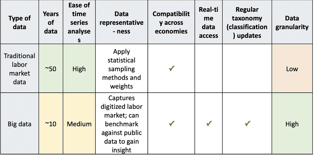 While big data doesn’t boast as long a time horizon as traditional sources that have often been collected for five or more decades, real-time data gives policymakers access to data that is more granular and can capture emerging skills, such as changes in technology, much more quickly.