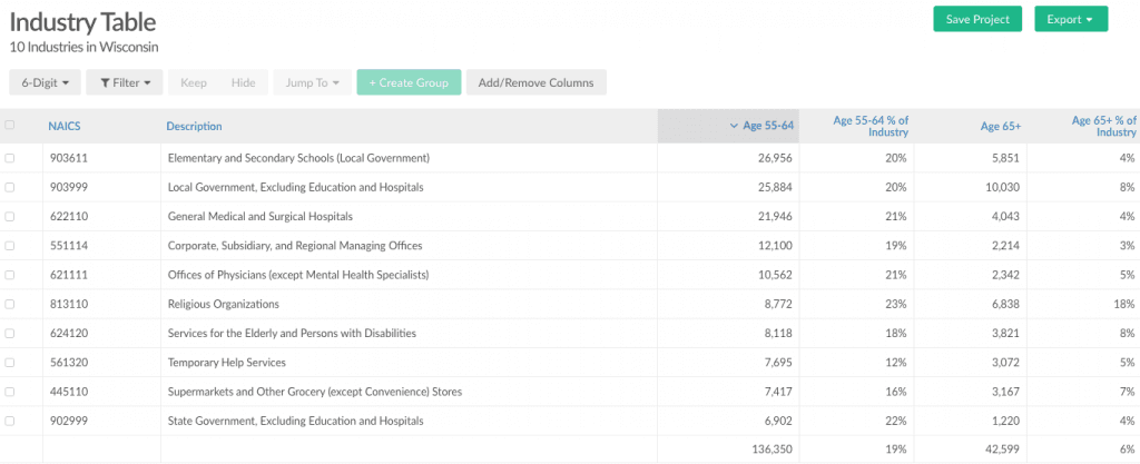 Pulling the 6-digit NAICS code level, the table can quickly reveal the makeup of industries by age and the percentage of the industry that age group represents. Looking at Wisconsin as an example, industries such as education will have already felt the impacts due to school closures. But of the top-10 industries, the 55+ age group is a big part of providing services to the elderly and disabled (NAICS 624120) as well as supporting grocery store operations (NAICS 445110).