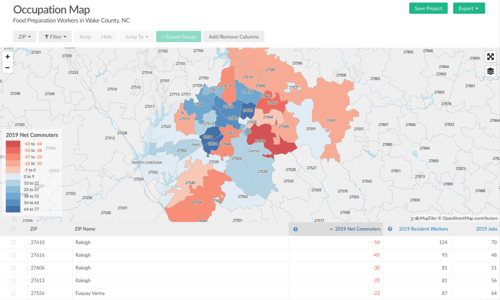 The Occupation Map can detail the number of workers who reside in the same zip code in which they work, and how many commute in or out of the zip code. If leaders in Wake County, NC wanted to get a sense of how much food preparation workers commute, the Occupation Map reveals how many workers reside and work in the same zip code, which zip codes have the most workers leaving, and which have the most entering.