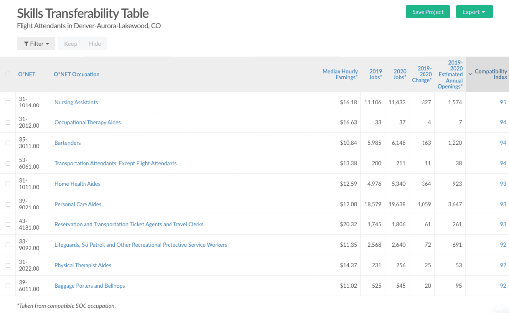 In Denver, CO, the home of Frontier Airlines, five of the top 10 occupations which flight attendants are most compatible with are healthcare support roles. With the healthcare industry strained, expanded opportunities in various health aide roles can be an option as the air travel industry recovers (keeping in mind that many health care occupations require a certification).
