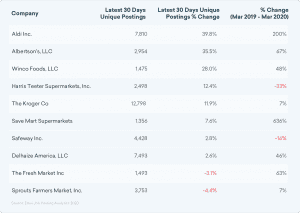 You’ll see Kroger and Safeway among the top 10 grocery stores in growth mode right now. All of these stores have posted at least 1,000 jobs in the last 30 days. It’s also worth noting the huge percent changes for some of these stores’ job postings from March 2019 to March 2020—particularly Save Mart Supermarkets (636%) and Aldi (200%).