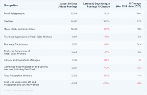 Below are the top 10 occupations these grocery stores are posting for. We can see that front-line workers like retail salespersons and cashiers have increased in demand over the last 30 days. And while demand for stock clerks has slightly decreased in that same time frame, there are still over 12,500 job postings for these workers—an 18% increase from March 2019.