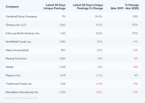 Below, we can see the top 10 growing food manufacturing companies that have posted at least 750 jobs in the last 30 days. Again, note the large percent changes between March 2019 and March 2020 for the top three companies.