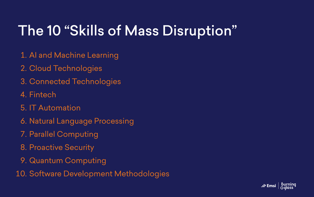 Building a Disruptive Workforce analyzed millions of career profiles to identify how employers are finding workers with the top 10 disruptive IT skills reshaping the tech industry, such as cloud computing and artificial intelligence (see the full list below).