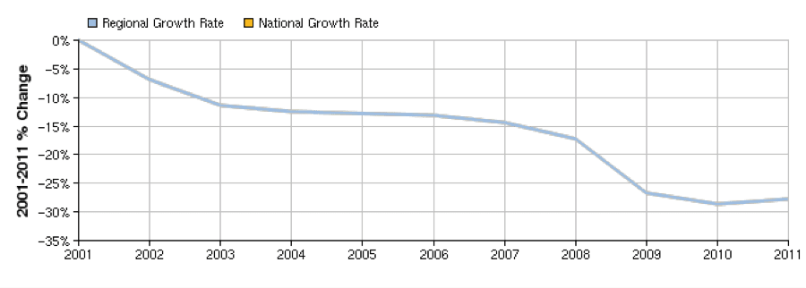 The new EMSI data (2011.3) just came out last week. We always think of the manufacturing sector as one of perennial interest. For a little context, here’s what the manufacturing sector has done historically: