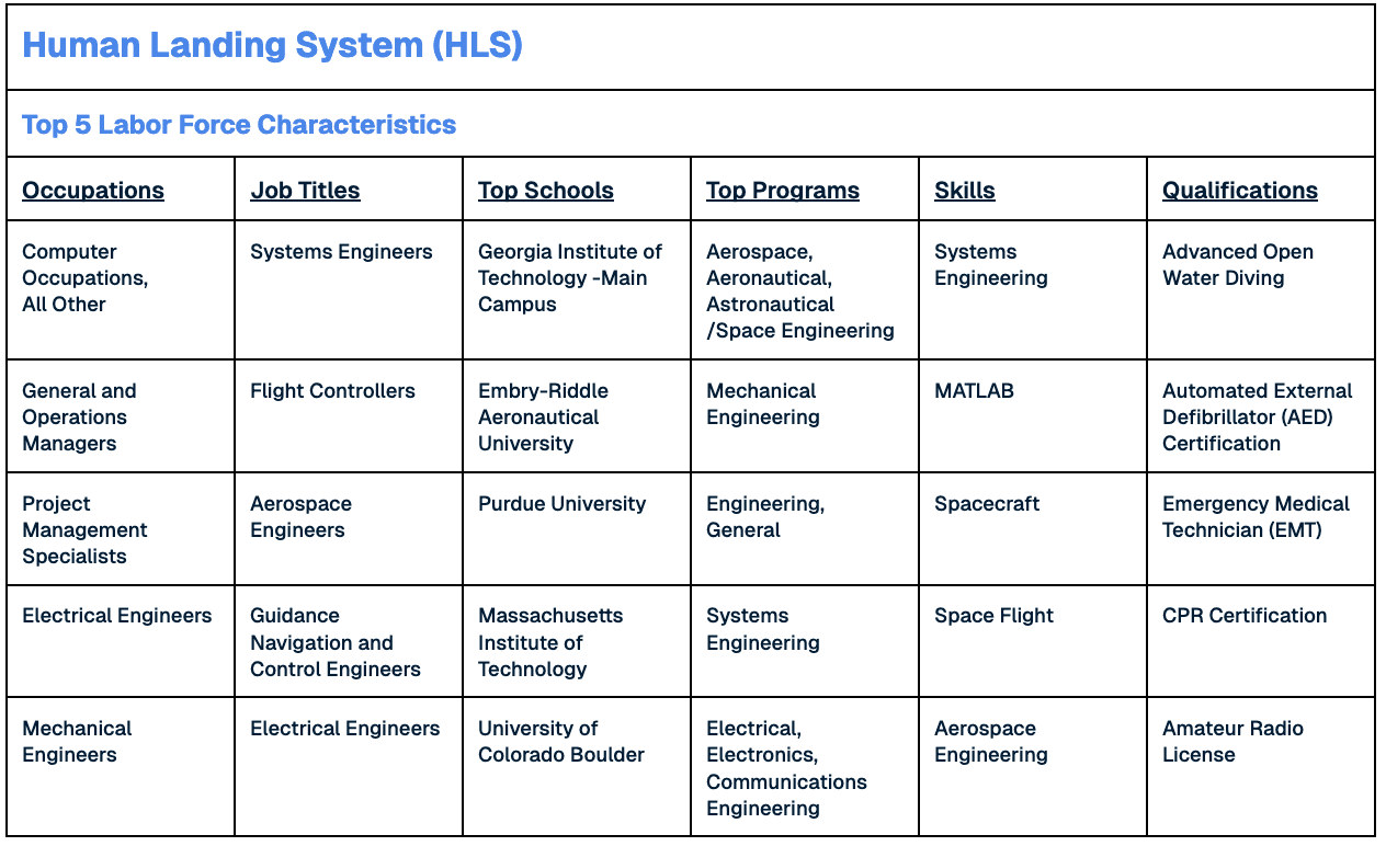 Arguably the most momentous achievement of the Artemis program will be when the Artemis IV astronaut crew lands on the moon. This will require a dynamic mission of precision, advanced technology, and skill. According to NASA, “the Human Landing System (HLS) program is working with U.S. industry to develop the landers that will safely carry Artemis astronauts from lunar orbit to the Moon’s surface and back.” NASA contracted with SpaceX to develop Starship HLS for Artemis III and IV and contracted with Blue Origin to develop the Blue Moon MK2 Lander for Artemis V. The workforce characteristics of the Artemis HLS program are seen below.