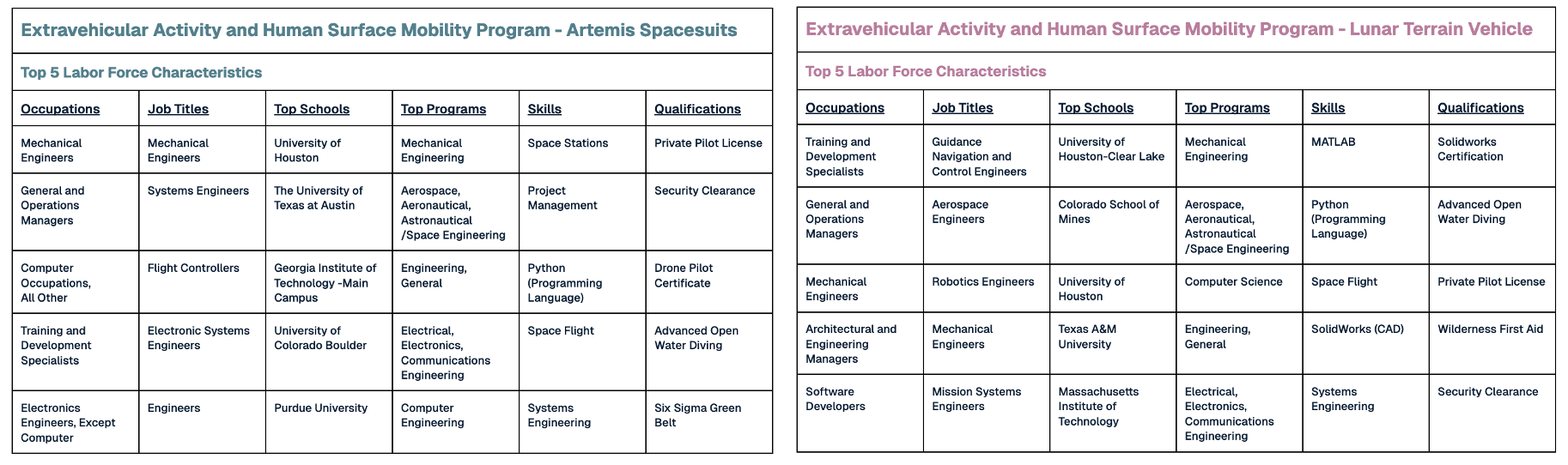 Distinguishable and relevant skills and qualifications are also important to consider for an astronaut selection program. Top specialized skills include Project Management, Systems Engineering, Aerospace Engineering, Flight Testing, and Data Analysis.
