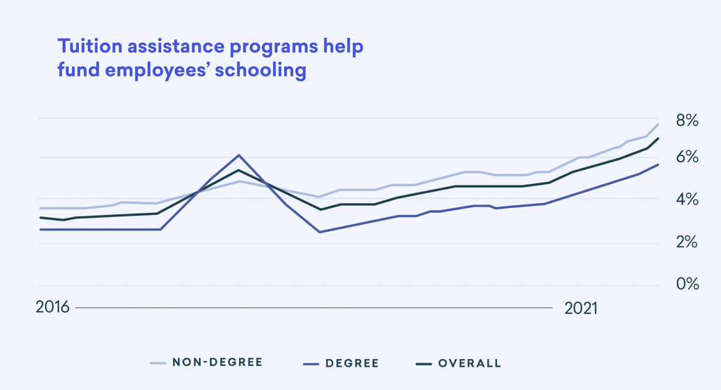 It’s not surprising then to see the rise in postings that advertise a tuition-assistance benefit, especially in roles that do not require a degree (meaning these jobs could become a pathway to higher education for the individuals that take advantage of that benefit!)