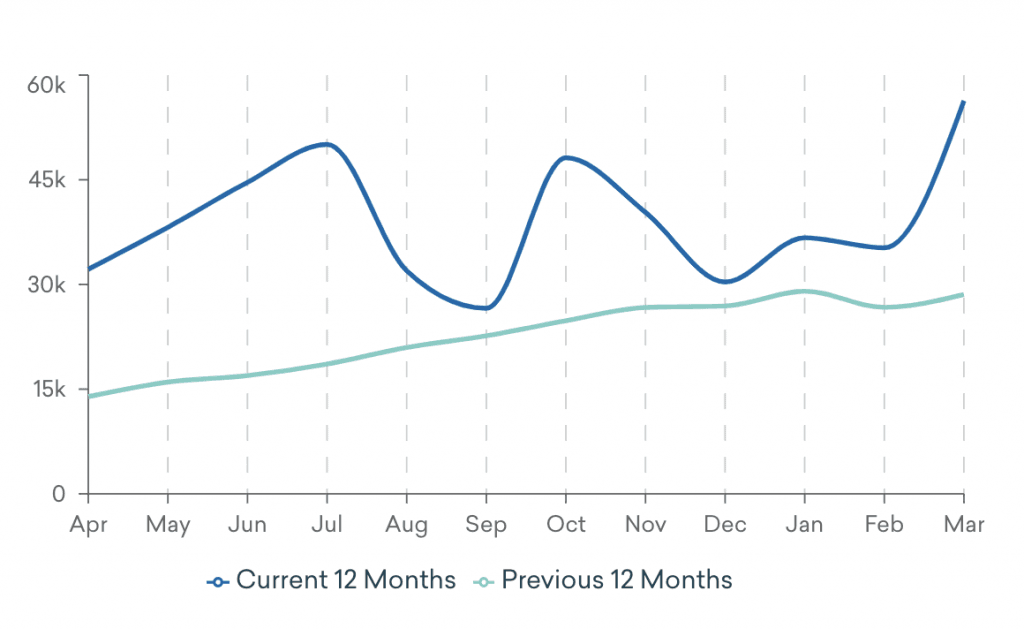 Using the dashboard, we can see that at the end of March, Amazon had over 56,300 active job postings—up 97% from last year. The vast majority of the postings are in Washington state.
