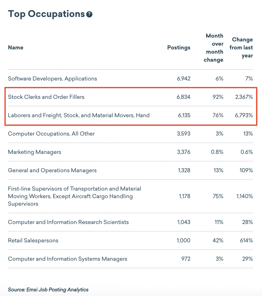 We can also see which occupations within Amazon are most affected by this hiring spree. Software developers take the lead with the most active job postings (nearly 7,000), up 7% from last year. But it’s the warehouse and delivery occupations that have seen the most massive jumps from last year.