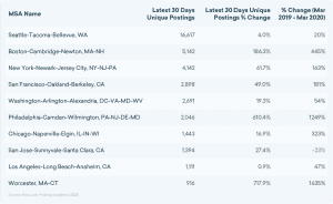 For example, we know Amazon is hiring 100,000 warehouse and delivery workers, but where are they posting for that talent? Unsurprisingly, Seattle (Amazon’s headquarters) comes in first, by a lot.