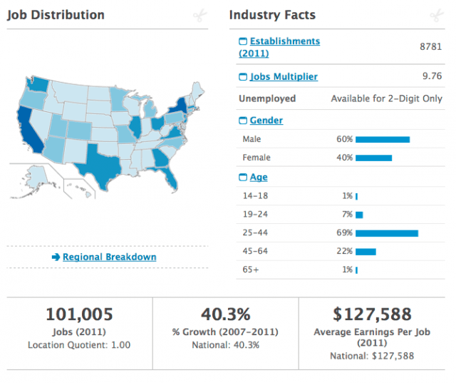 State Name2007 Jobs2011 Jobs% Change2011 Avg. Annual Wage2007 National Location QuotientCalifornia26,20037,86245%$179,4683.17New York6,05111,47990%$128,9681.35Massachusetts3,9286,71071%$109,7812.31Washington3,0884,84057%$103,4931.97Ohio4,7134,569(3%)$82,0831.67Florida3,1573,80120%$70,3700.75Illinois2,7003,42927%$89,6800.87Texas2,2342,99134%$74,2110.41New Jersey1,9632,32919%$99,4420.94Virginia2,0572,1756%$109,0131.02Georgia1,0412,086100%$83,9830.48Colorado1,3841,96342%$84,5281.13Utah1,8711,9414%$71,1082.87Pennsylvania1,0741,73161%$98,8840.36North Carolina9141,56972%$67,8160.42Connecticut1,4671,451(1%)$156,0021.65Michigan355843137%$110,3010.16Minnesota7517885%$78,3530.53Maryland7307503%$95,6120.53Arizona6977122%$72,7390.50Oregon35871098%$81,0160.39District of Columbia635554(13%)$115,0021.75Missouri33549748%$48,6710.23Nevada40746013%$79,2530.60Tennessee30638425%$72,9450.21Indiana31037120%$61,0390.20Alabama172359109%$51,8960.16Kentucky25533632%$59,9140.26Oklahoma340321(6%)$61,4480.41New Hampshire27732016%$77,2810.83Louisiana145305110%$55,9410.15Idaho25130321%$71,9370.71Wisconsin2272489%$64,0530.15South Carolina92245166%$55,5620.09Iowa411234(43%)$59,8020.52Vermont220200(9%)$44,4071.38Kansas96198106%$62,4470.13Nebraska12919551%$56,9970.26Arkansas173155(10%)$46,3320.27Hawaii708217%$70,1520.20Maine73787%$50,2150.23New Mexico10077(23%)$49,6970.23Rhode Island63665%$79,2030.25Montana326294%$41,3320.14Delaware385442%$71,1470.17Mississippi1735106%$55,6760.03North Dakota1128155%$41,8340.06West Virginia24254%$59,8550.06Wyoming3421(38%)$88,4980.22South Dakota2211(50%)$111,9750.10Total719971009530.4127638