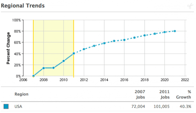 This is part of a series reviewing industries that have experienced greater than 40% employment growth since 2007. Click here to see the summary. Data and analysis comes from Analyst and EMSI’s fourth quarter 2011 data release. Contact Rob Sentz (rob@economicmodeling.com) with questions. You can also follow EMSI @DesktopEcon.