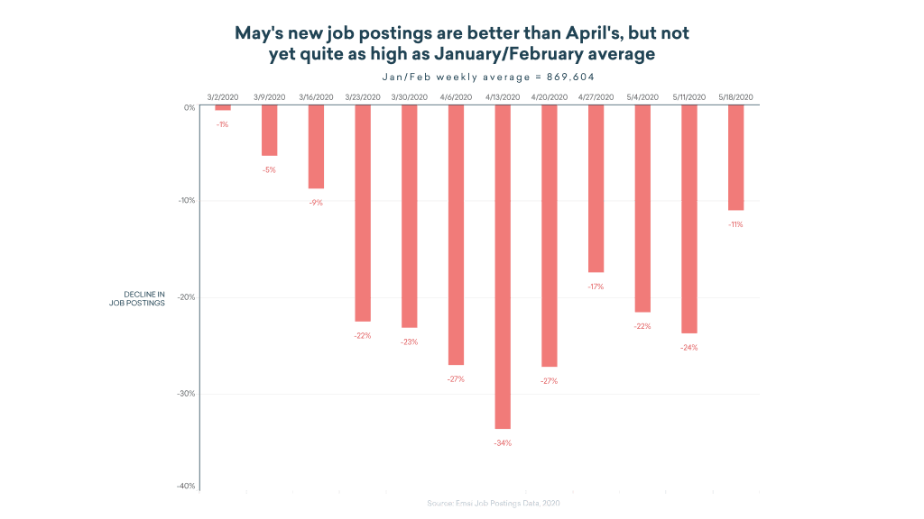 Note: Job posting data from the fourth week of May is still fluctuating, so the chart displays job postings only through the third week of May.