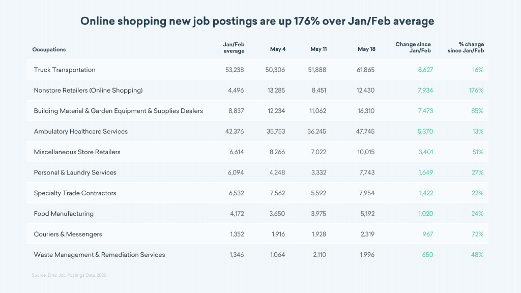 Nonstore Retailers (online shopping) posted more than every other industry besides Truck Transportation. It had nearly 8,000 more new job postings (+176%) than its January/February average. Even as stay-at-home orders lift in numerous states, Americans continue to rely heavily on safe and convenient shopping from the couch—some for the first time. A recent analysis by ClearSale discovered that between March and April, the average number of brand new online shoppers rose by 12% in the US. Digital Commerce reports that in April alone, online sales increased 49% over 2019, and predicts that online shopping will continue to grow for the rest of 2020.