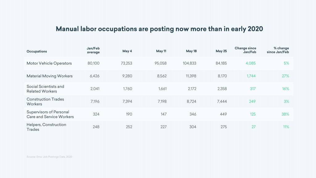 Several occupations featuring manual labor are posting more now than they were in January/February. Motor Vehicle Operators (4,000 more new postings, +5% over Jan/Feb), Material Moving Workers (1,700 more new postings, +27%), Construction Trades Workers (249 more new postings, +3%), and Helpers, Construction Trades (27 more new postings, +11%).