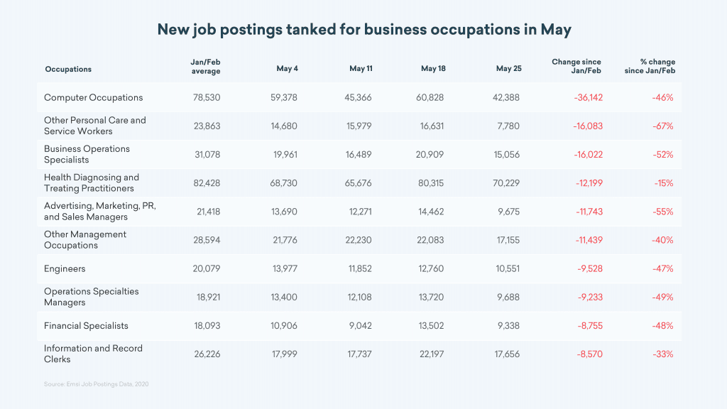 Check out our free job posting dashboard to get the most up-to-date view of the labor market’s response to COVID-19 . You can also find more COVID-19 research, tools, and webinars on our COVID-19 resources page.