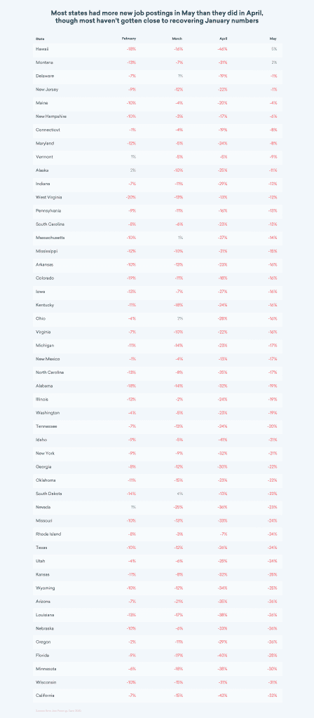 Nearly every state saw at least a slight decline in new job postings starting as early as February. Most, however, have now begun to recover, though the majority are still a long ways from climbing back up to January’s numbers.