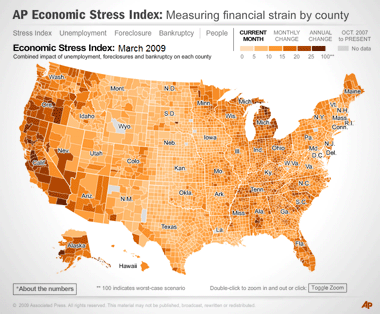 The Associated Press has generated a neat interactive map that gives a look at unemployment, foreclosure, and bankruptcy rates for every county in the U.S. The AP has combined all the figures to come up with an Economic Stress Index for each county, as of March 2009. The map also benchmarks the numbers to October 2007.