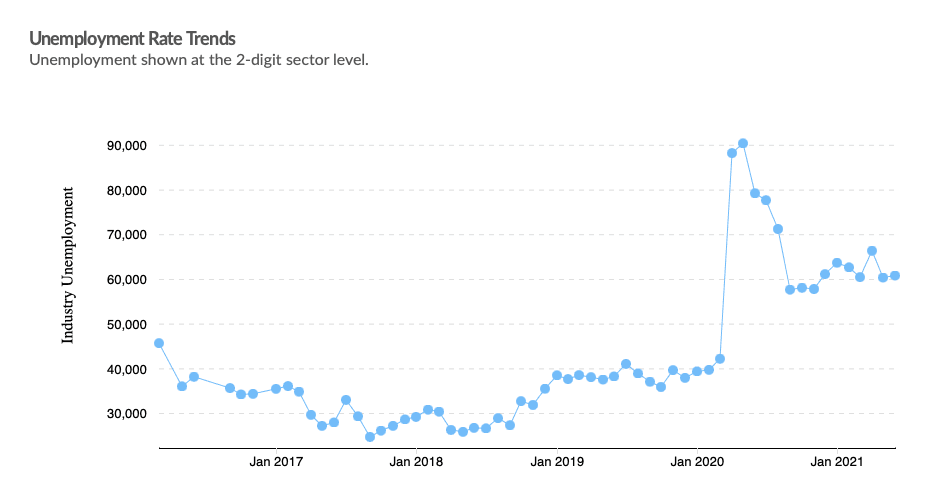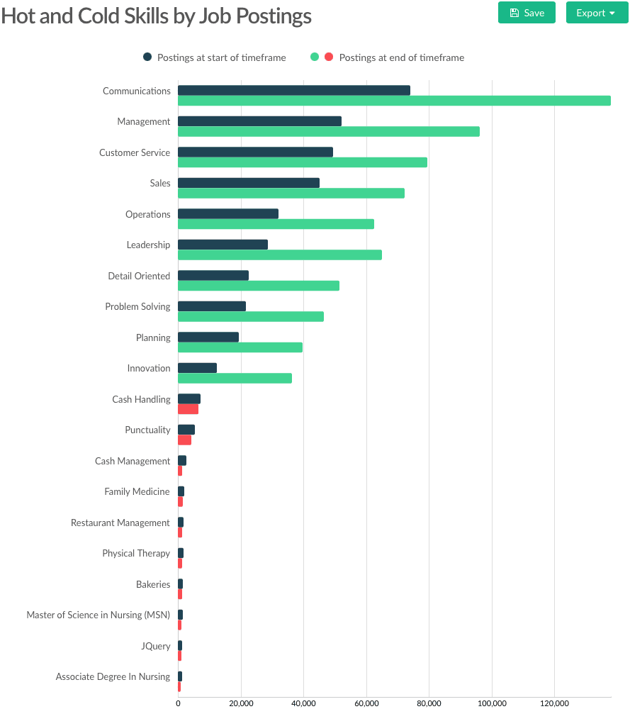 This is a brand new report to allow a community to swiftly identify the “hot” skills of their region by providing an overview of the largest increases and decreases of skill postings over a certain period of time. Right now there are 9.5 million people unemployed and yet there are 10 million job openings. This report helps communities and jobseekers pinpoint the skills needed to fill those openings. To aid workforce organizations in this work, we’ve also just launched SkillFit (link), a tool designed to help case managers identify their client’s skills and help them gain better employment or necessary training—all based on skills.
