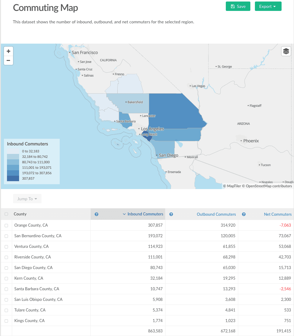 With the Commuting Map feature live, you can now access point-to-point commuting data for your region. This includes inbound and outbound commuters and provides a net commuter number. You can also look up this information via zip code, allowing a very granular look at commuting patterns.