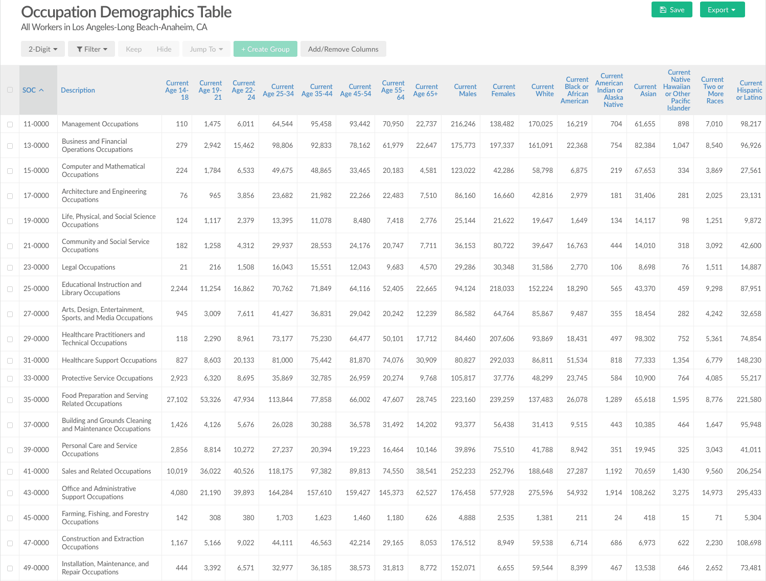 The new Occupations Demographic Report has been one of our most user requested features. With this new dataset and report we are able to showcase the demographic breakdown of every occupation. Below is a table containing a list of various occupations for the Los Angeles MSA. We can divide the data by age, gender, race, ethnicity, and even identify historical trends.