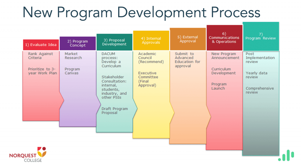 The plan includes a seven-step process (pictured above). Potential program ideas were vetted by the Academic Leadership Team. Viable program ideas then moved into the development process, including labour market research and curriculum development via the Developing a Curriculum (DACUM) method, before being presented for internal and external approval. Approved programs would then be implemented, and eventually evaluated as part of NorQuest’s regular practice of program review.