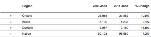 The Niagara jobs are also paid somewhat less — $82,800 a year, compared to $95,672 in Bruce and $99,908 in Durham. But that $82,800 is still significantly above the national average, and since 2006, jobs in all three Census Divisions have increased at a rate higher than the provincial or national average. Going forward, the hydroelectric and nuclear sectors of the Ontario power generation economy seem ready to continue providing large numbers of highly paid careers to Ontario residents and adding significant financial input to the Ontario economy.