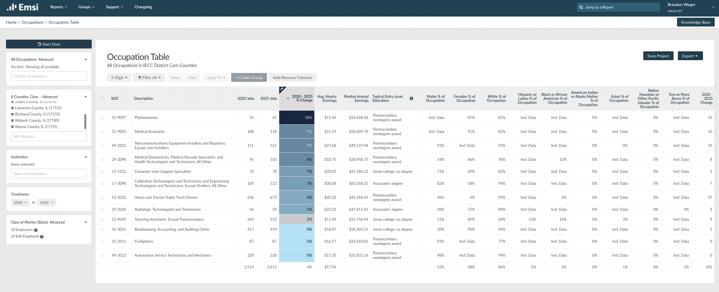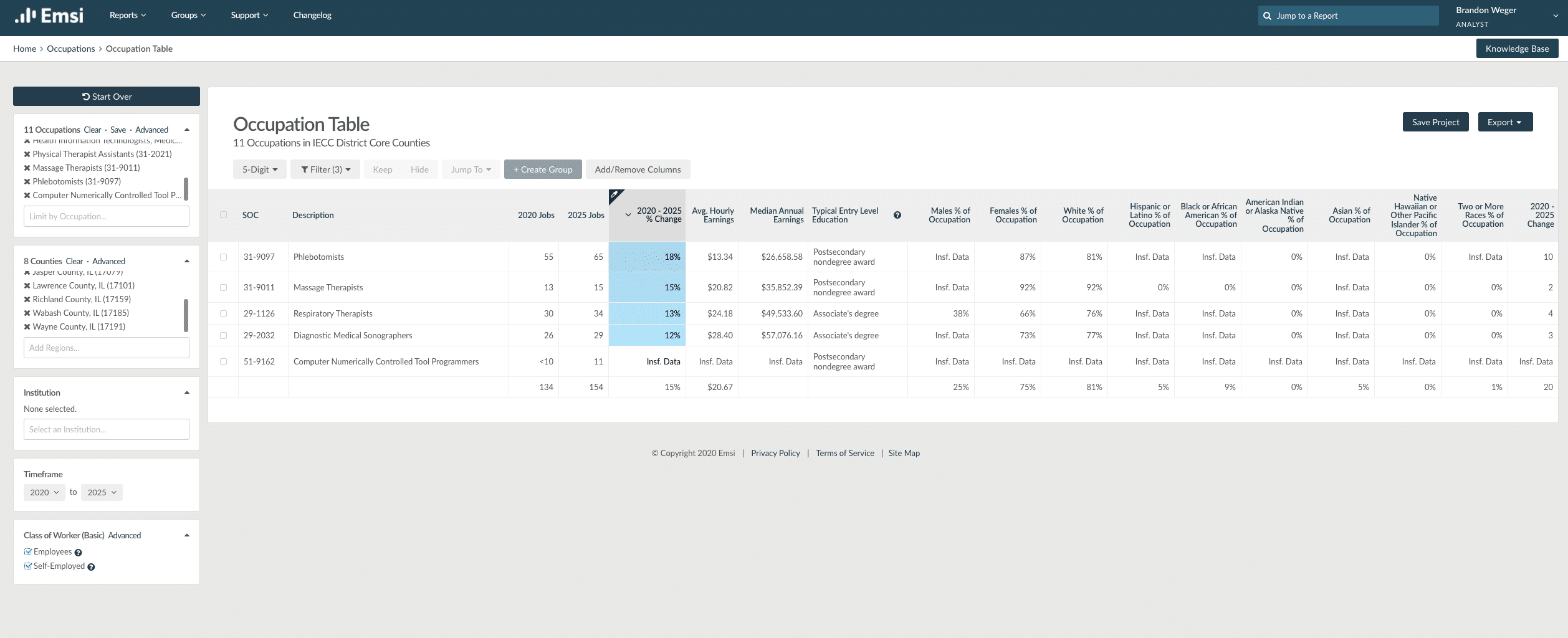 Although Perkins V was the primary motivating factor for Weger to gather data from Analyst, he started looking at broader ways IECC could leverage Analyst to better serve their region. IECC needed to figure out what the region’s growing occupations were compared to emerging occupations in order to best serve those markets, so Weger pulled a couple of occupation reports and saved them as projects within Analyst so he could go back at any time for further analysis. They also needed to determine which markets were forecasted to grow over the next 5 to 10 years, what occupations had experienced long-term growth, and the demographics of each industry.