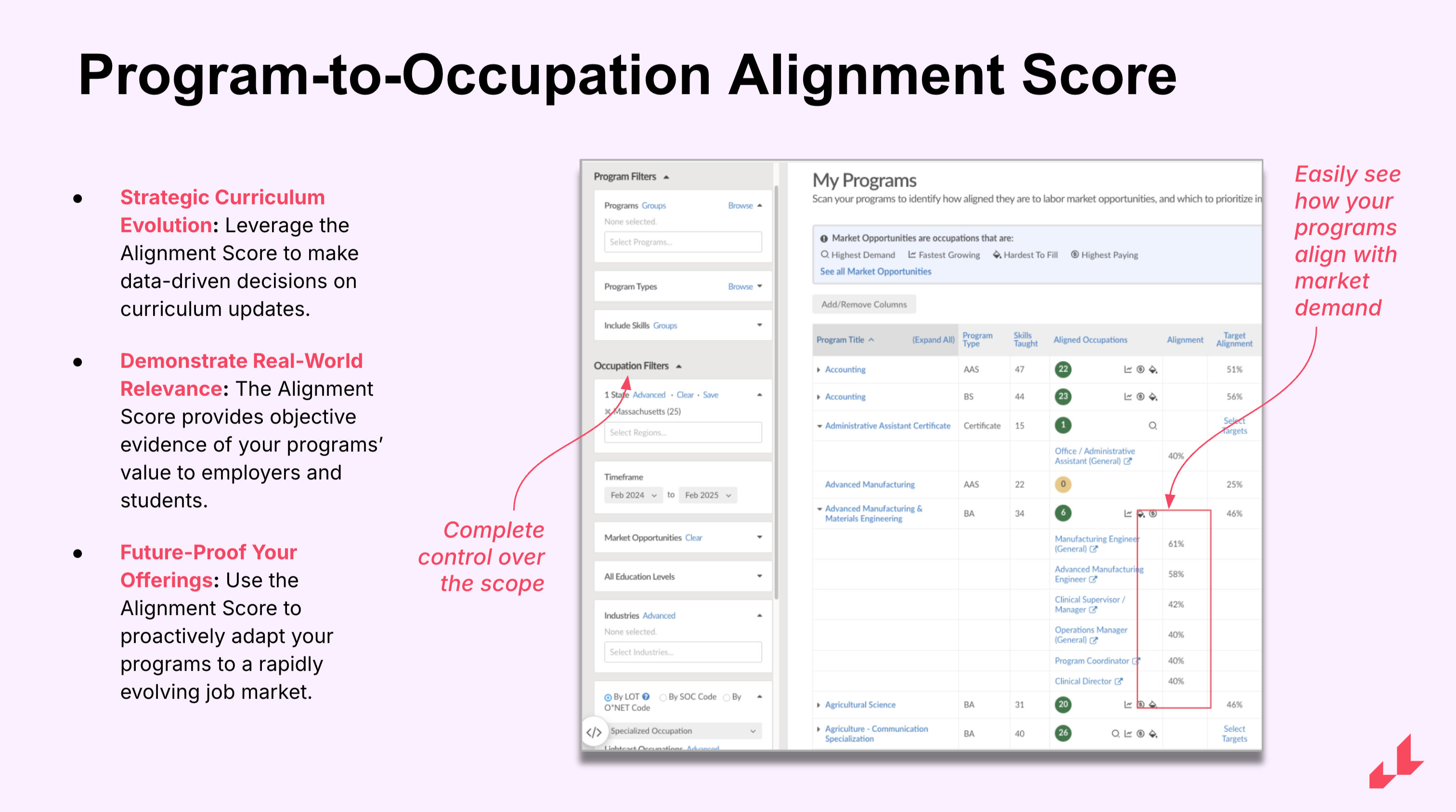 After connecting your program content to our comprehensive labor market data, Skillabi generates a Program-to-Occupation Alignment Score that provides an objective snapshot of how well each academic program is aligned to the skill requirements of relevant target occupations.Actionable insight for strategic decisions