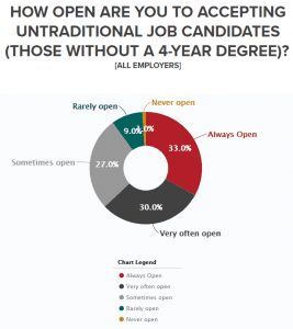 White-collar and blue-collar jobs have defined the American workforce for about 90 years. Now we are seeing “new-collar” jobs emerge – those that may not require a bachelor’s degree, but do require a highly specialized skill set – challenge the status quo of what a person needs to land a job, excel at a job, and define their career. Recent employer survey data from The Learning House confirms that 9 in 10 employers are open to hiring candidates without a four-year degree. The shift in employers’ emphasis – from degrees to skills – is happening now, and is most prevalent in information technology jobs.
