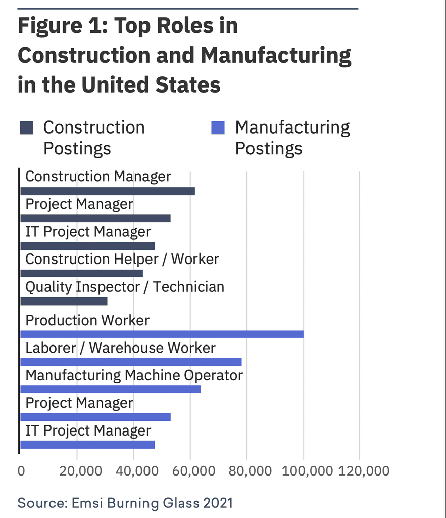 While for manufacturing, the most posted-for occupation is production worker, for construction, it’s project manager.