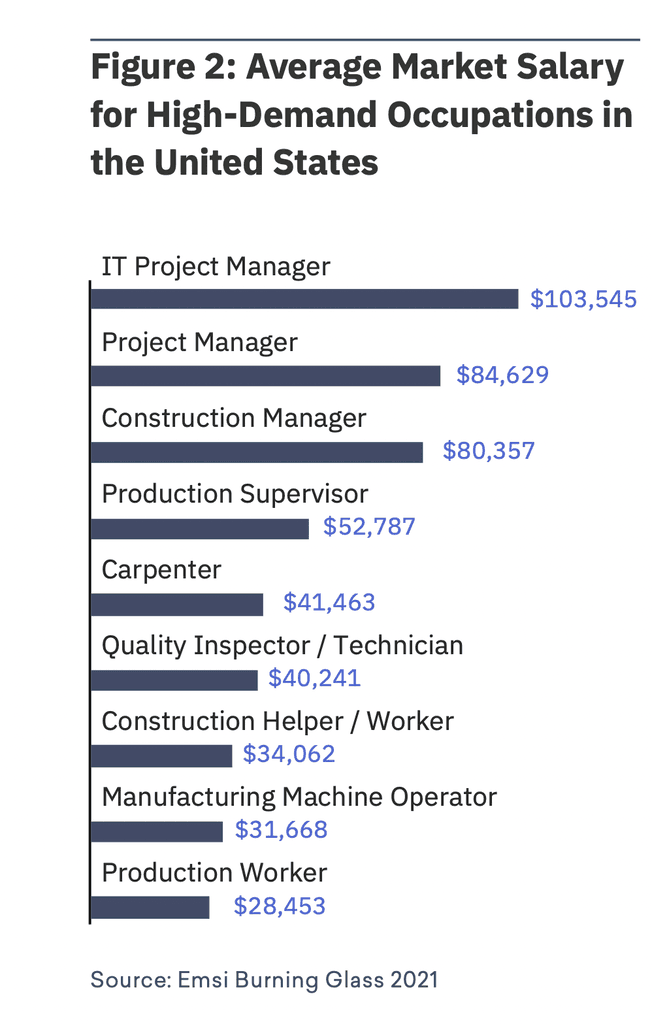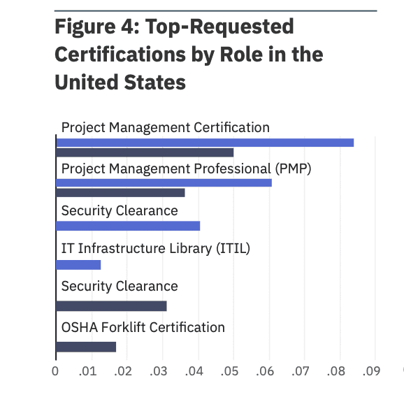 Certifications may be taking on some of the role of four-year educational credentials. Project Management Certification and Project Management Professional (PMP) are the most in-demand certifications for both Construction and Manufacturing.
