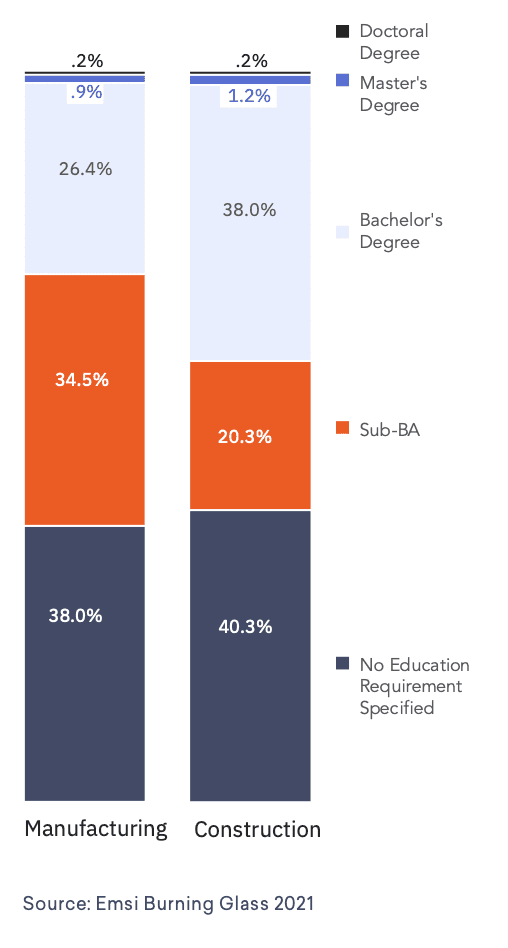 Jobs in the Manufacturing and Construction industries fill some of the most fundamental needs in the economy, and employ millions of people. Skilled Beyond Degree: How Experience is Outpacing Education in Construction and Manufacturing Hiring, a new Emsi Burning Glass report in partnership with Autodesk, finds that these jobs are changing in important ways. There’s less emphasis on formal education and more on certifications, while demand for key business and data skills is high. Below, we’ll dive into a few key findings.