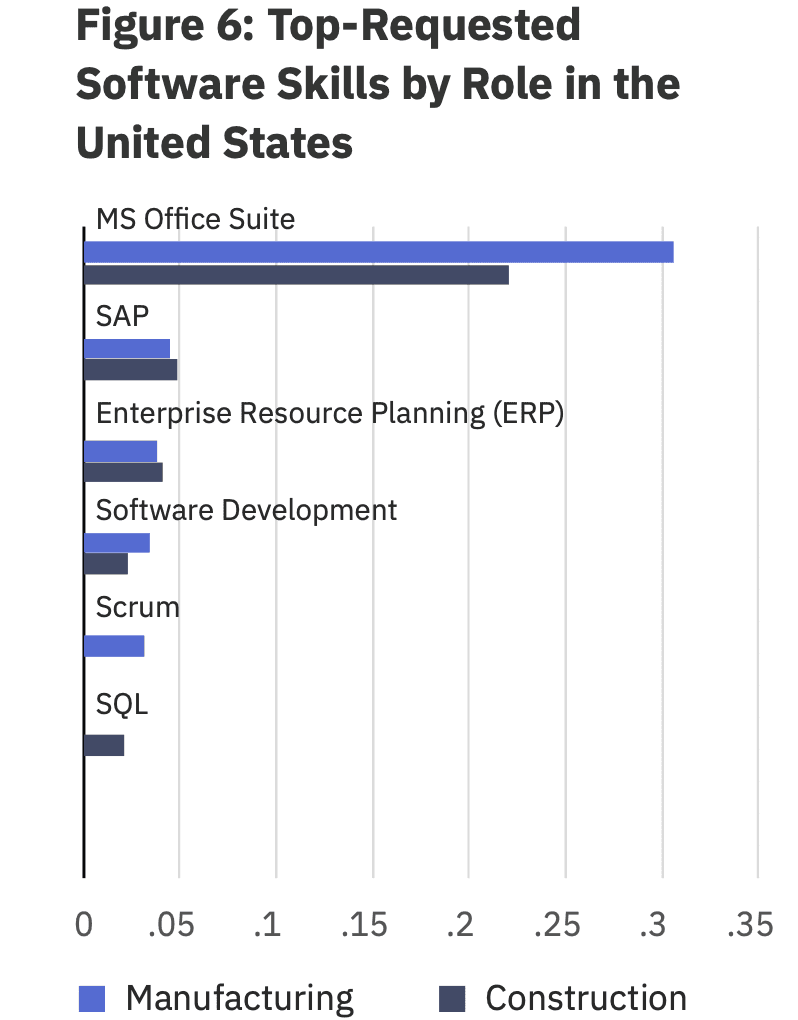 Among software skills, MS Office Suite was the leader, appearing in 30.6% of posts in Construction and 22% in Manufacturing. Software Development appears in the top five software skills for both industries, while Scrum makes the top five only in Construction, and SQL only in Manufacturing.