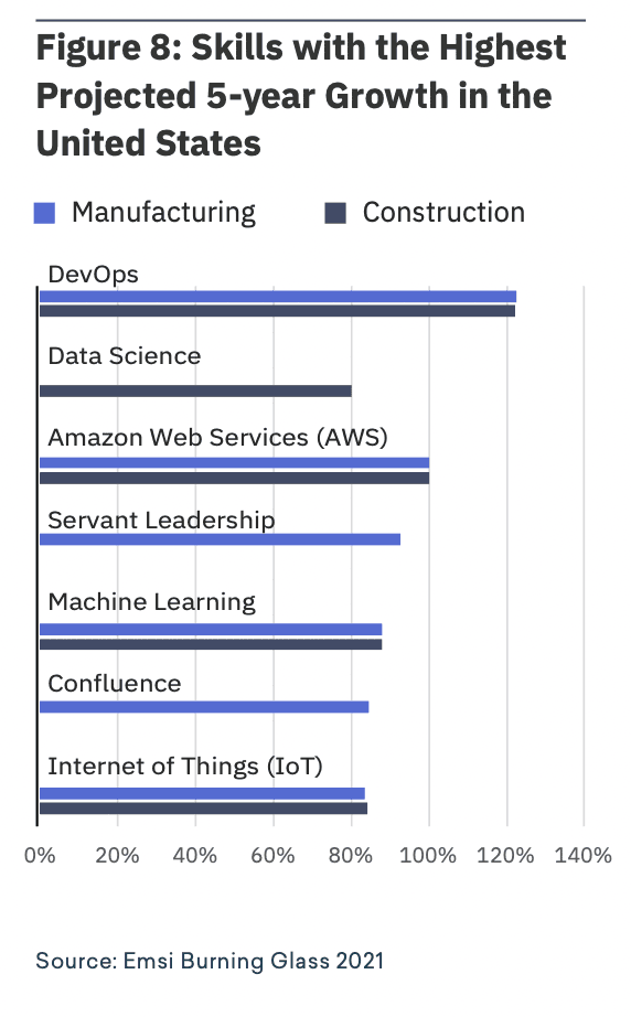 Over the next five years, the skills projected to grow the most are significantly more advanced than MS Office Suite. Dev OPs is projected to grow by 122% in each industry, while Amazon Web Services is expected to grow by 100%. Notably, only Construction is projected to see a human skill in the top five, with Servant Leadership projected to grow by 93%/
