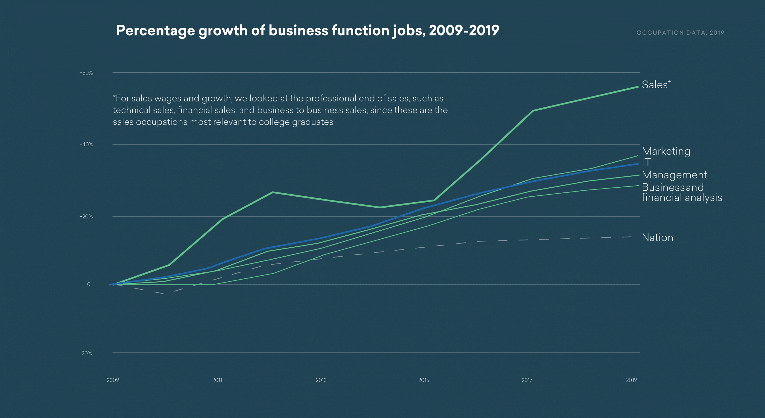 Such business-related roles have grown significantly over the last decade, rivaling the demand we see in IT roles. Since 2009, we’ve seen over 710,000 new sales jobs, over 504,000 new marketing jobs, and 1.8 million-plus management jobs hit the market.
