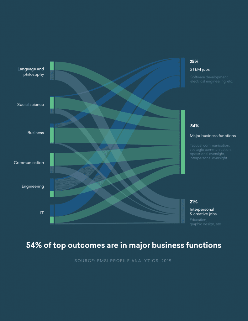 Of the graduates we analyzed in our latest report, Degrees at Work, from popular degrees like language and philosophy, social sciences, business, communications, IT, and engineering, 54% actually end up in major business functions.