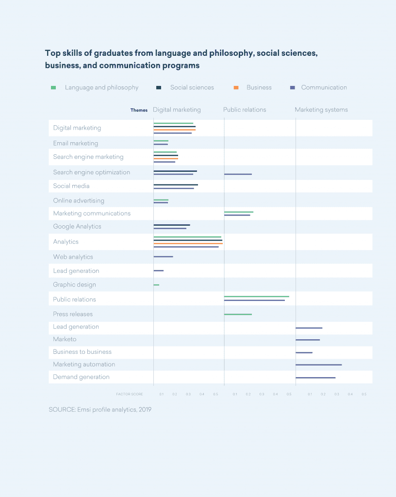 Both communications and language and philosophy graduates have public relations skills, while marketing systems are dominated by business and language and philosophy graduates. In fact, across marketing, language and philosophy graduates might be the single most versatile group.