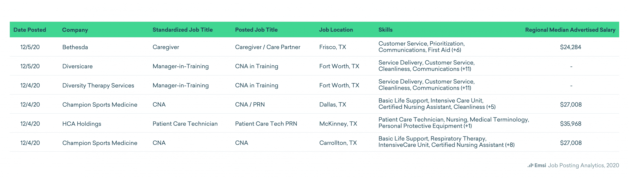Say your staffing company is having success filling reqs for nursing assistants and you want to find opportunities to saturate that market. To do that, you’ll need to know who the top employers are, where they’re located, what their advertised wages are, and how recently they’ve posted.